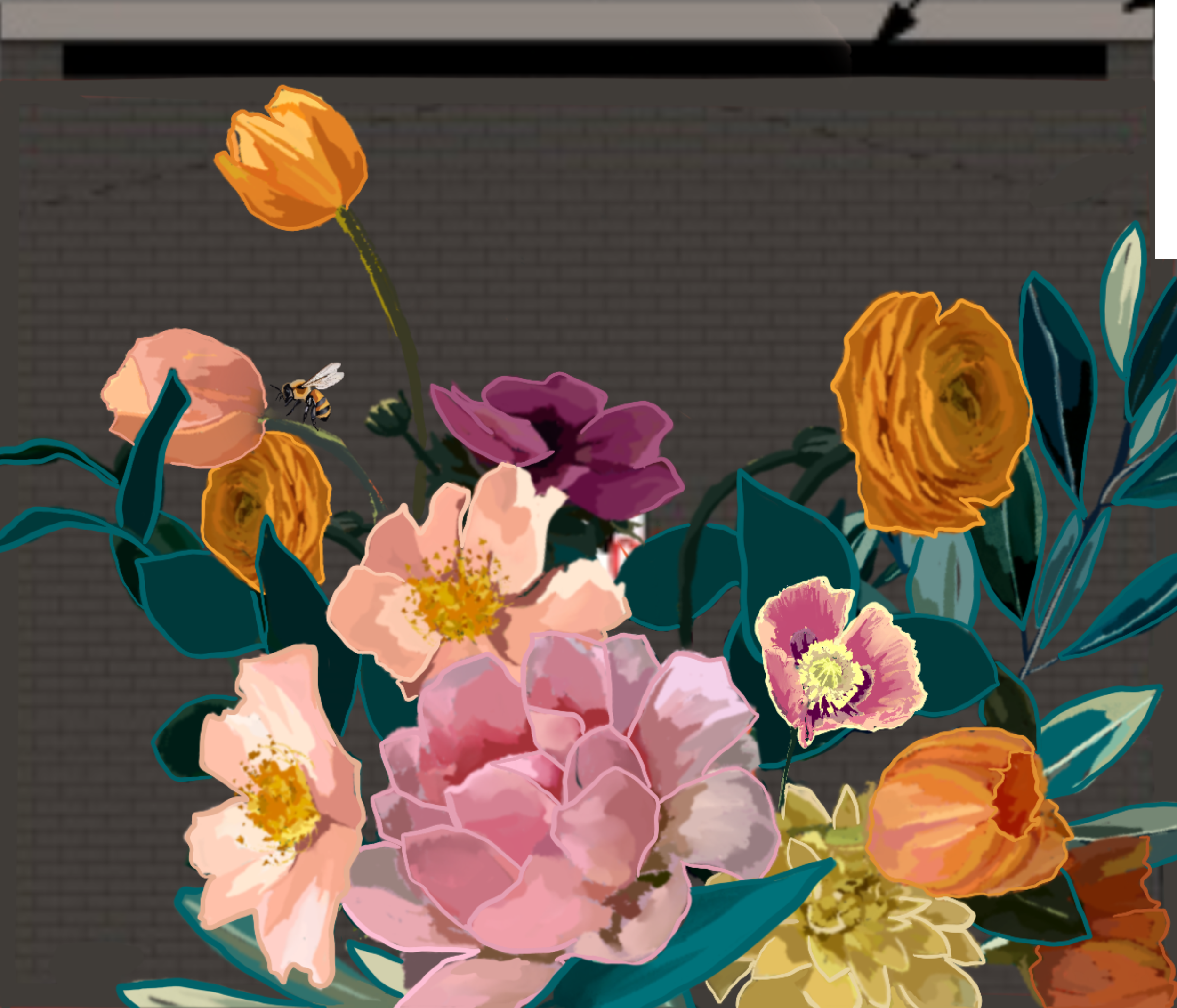 Unique floral arrangements with pollinators in flight wrap each structure in colorful bouquets.